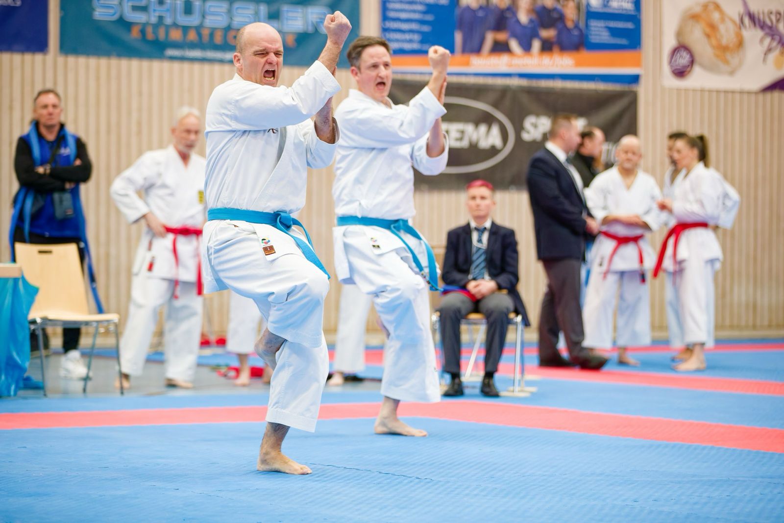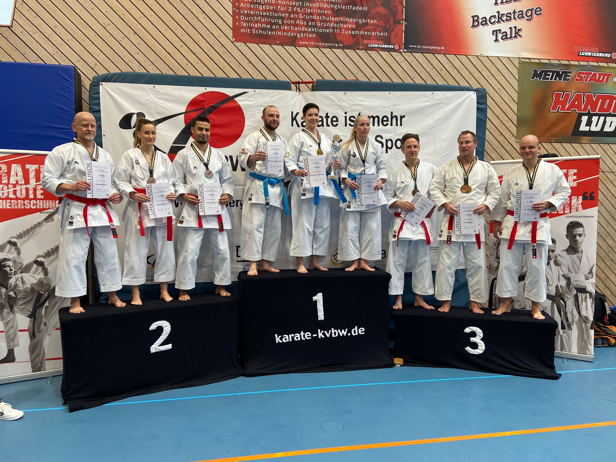 Nach einer Erholungspause ging es dann, etwas schneller als erwartet, wieder ins Getümmel im Wettbewerb Kata Team mixed. Nach einem eher verhaltenen ersten Kampf ging es im kleinen Finale dann um den dritten Platz. Zum Zeitpunkt der Kampfes, auf der Tatami mitten in der Halle, waren alle anderen Tatami leer, so dass sich die ganze Halle auf das Team des PSV Mannheim konzentrierte und auch nicht enttäuscht wurde! Die drei Athleten zeigten eine stabile Empi und danach kamen sie beim Bunkai richtig in den flow, ließen es krachen, flogen durch die Luft, zeigten spektakuläre Sprungtechniken und wurden nach dem Abgrüßen mit herzhaftem Applaus und dem dritten Platz – Bronze – belohnt!