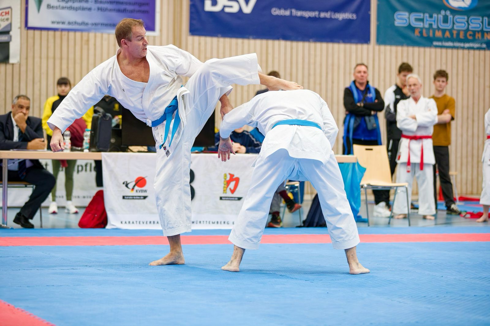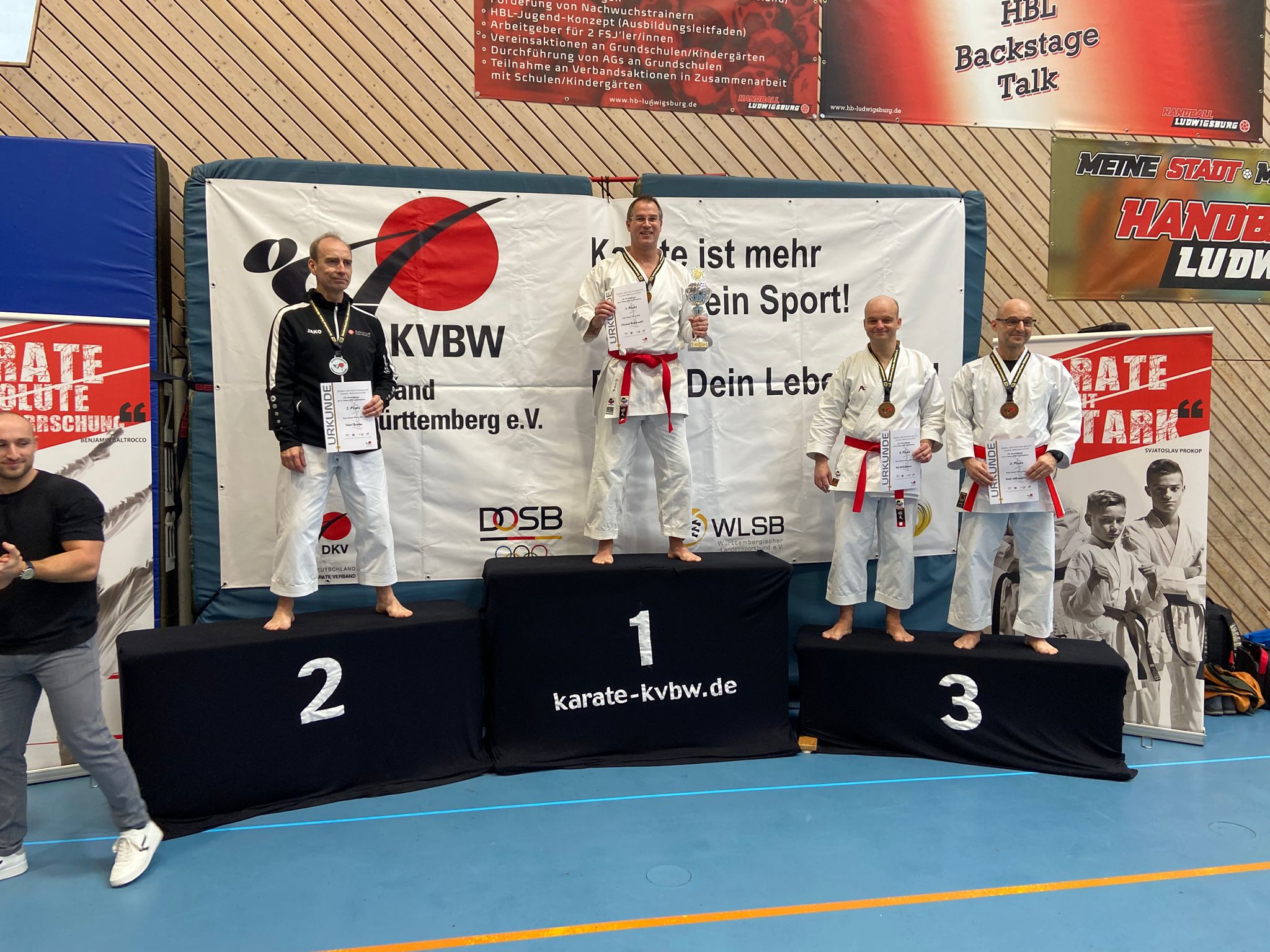Doch von Anfang an. Der Vormittag am 21.02.2026 der LM war ausgefüllt mit dem Kata-Einzel der Männer für Ulf und Thomas, souverän gecoached von Sebastian. Ein Wettkampf im Round Robin-Verfahren (jeder gegen jeden), der sehr erfolgreich ausging, da beide auf dem Treppchen landeten, Ulf mit Bronze und Thomas mit Gold – Landesmeisterschaft in Baden-Württemberg!